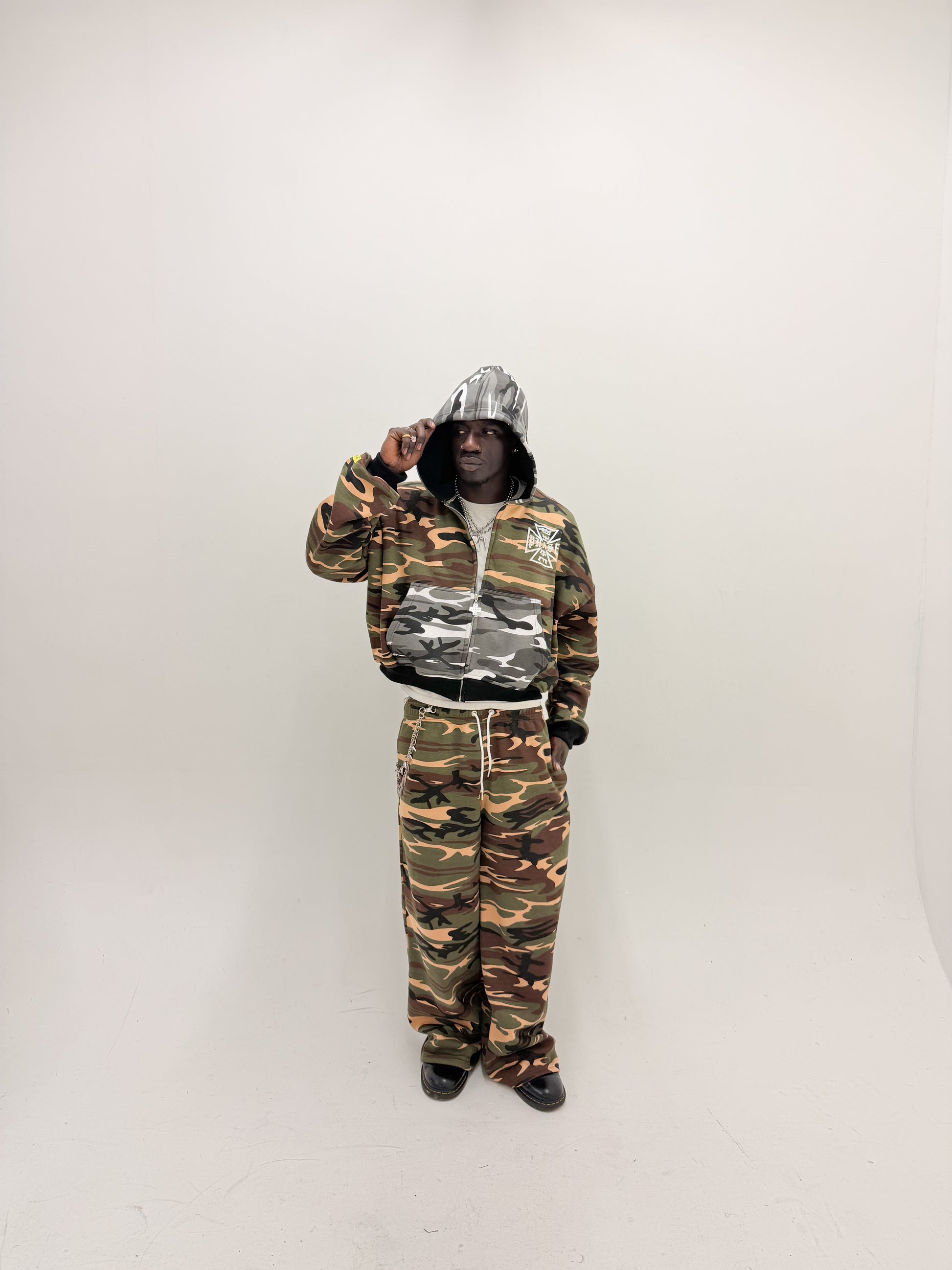 The single layered PHASE 2-Tone Camo Sweats features a dynamic clash of camo prints across the pocket on the back. This item is intentionally textured with a washed finish. Designed with a baggy fit and an elasticated waistline for comfort.